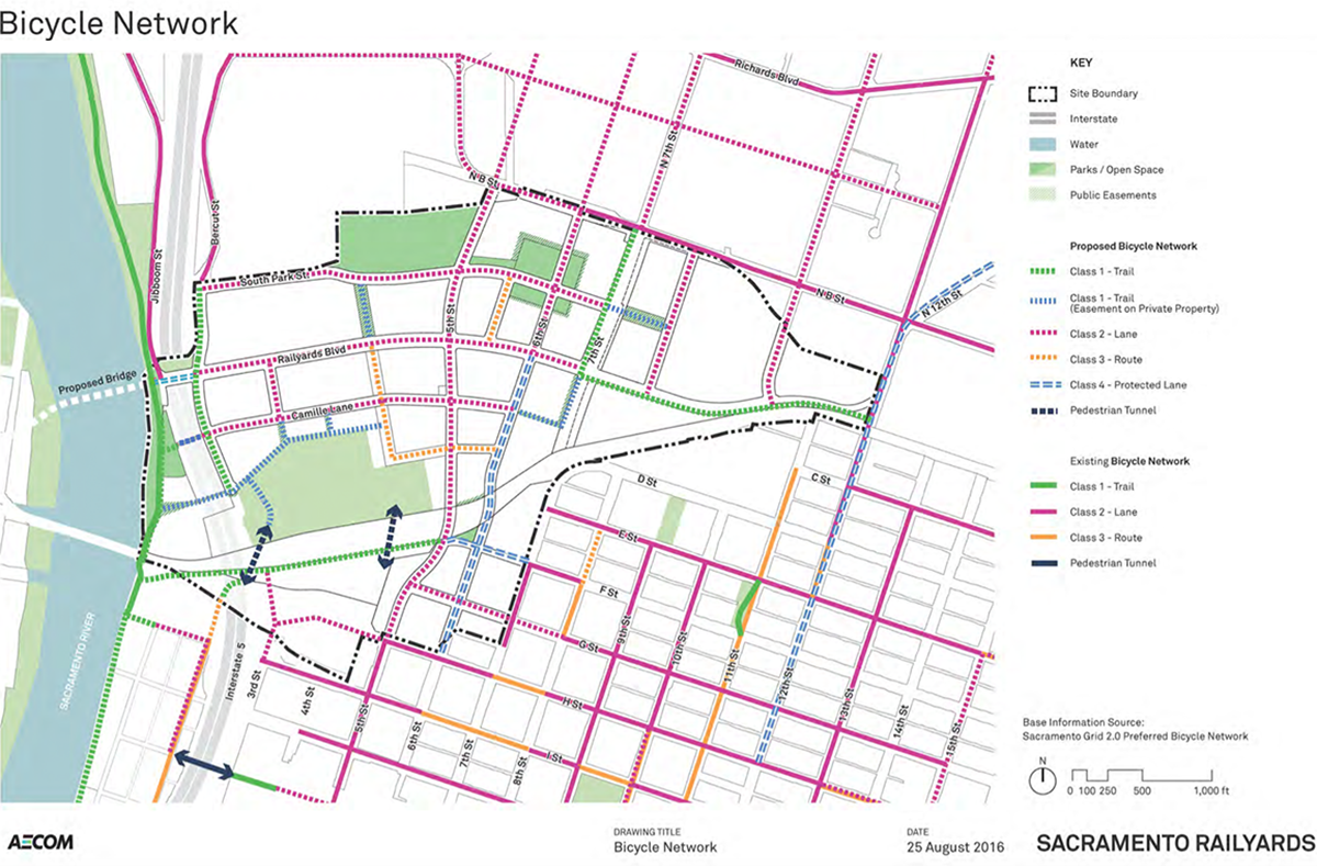 - Off‐street Class 1 pathways for bicycles and pedestrians will extend across the site in several places, including Railyards Boulevard, east of 7th Street; Bercut Drive; F Street, within the intermodal parcel through the Big Four Bend; and along the river, just west of Jibboom Street.